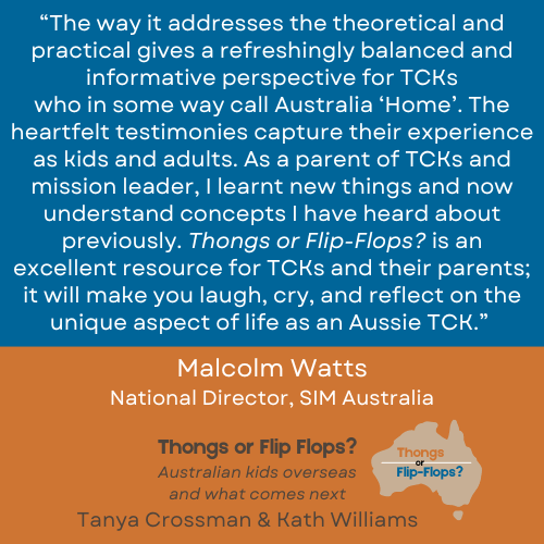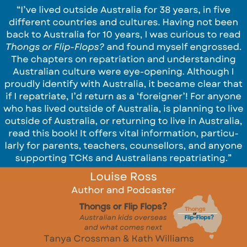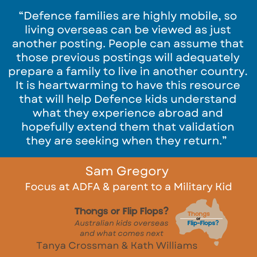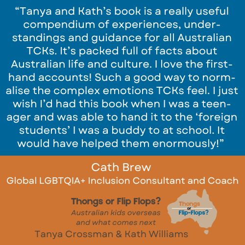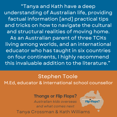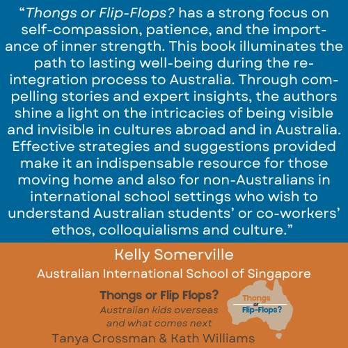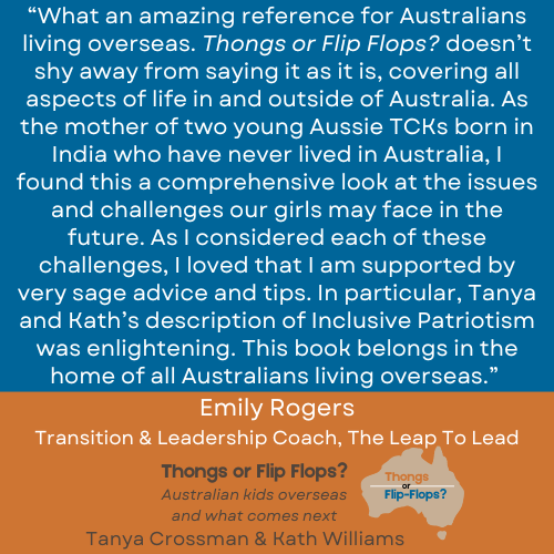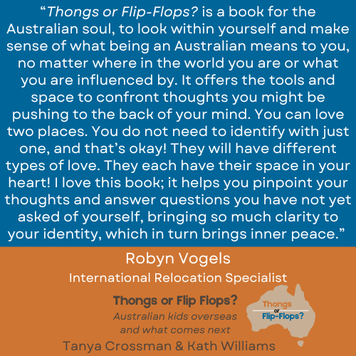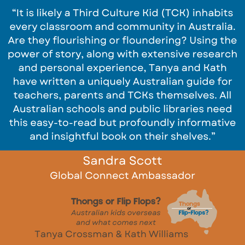 Tanya and Kath have each worked with Australian families living overseas for a long time. While there are a lot of resources for globally mobile families generally, there was nothing specific to the Australian context they could recommend. They joined forces to create Thongs or Flip Flops?, a book that shares struggles Australian children raised overseas often face, and strategies to find their way through to belonging and connection.